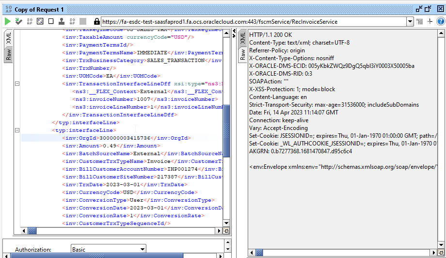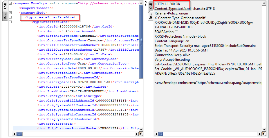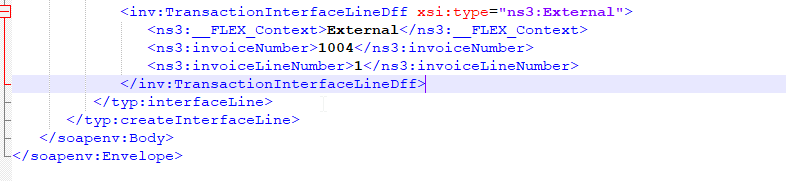 <soapenv:Envelope xmlns:soapenv="http://schemas.xmlsoap.org/soap/envelope/" xmlns:typ="http://xmlns.oracle.com/apps/financials/receivables/transactions/invoices/invoiceService/types/" xmlns:xsi="http://www.w3.org/2001/XMLSchema-instance" xmlns:inv="http://xmlns.oracle.com/apps/financials/receivables/transactions/invoices/invoiceService/" xmlns:ns3="http://xmlns.oracle.com/apps/flex/financials/receivables/transactions/autoInvoices/TransactionLineInterfaceLineDff/" xmlns:tran1="http://xmlns.oracle.com/apps/financials/receivables/transactions/autoInvoices/model/flex/TransactionInterfaceGdf/" xmlns:tran2="http://xmlns.oracle.com/apps/financials/receivables/transactions/autoInvoices/model/flex/TransactionLineInterfaceGdf/" xmlns:ns4="http://xmlns.oracle.com/apps/flex/financials/receivables/transactions/autoInvoices/TransactionInterfaceLinkToDff/" xmlns:tran4="http://xmlns.oracle.com/apps/flex/financials/receivables/transactions/autoInvoices/TransactionInterfaceReferenceDff/" xmlns:tran5="http://xmlns.oracle.com/apps/flex/financials/receivables/transactions/autoInvoices/TransactionLineDff/" xmlns:tran6="http://xmlns.oracle.com/apps/flex/financials/receivables/transactions/autoInvoices/TransactionInterfaceHeaderDff/"> <soapenv:Header/> <soapenv:Body> <typ:createInterfaceLine> <typ:interfaceLine> <inv:OrgId>300000003415736</inv:OrgId> <inv:Amount>0.49</inv:Amount> <inv:BatchSourceName>External</inv:BatchSourceName> <inv:CustomerTrxTypeName>Invoice</inv:CustomerTrxTypeName> <inv:BillCustomerAccountNumber>IHP001274</inv:BillCustomerAccountNumber> <inv:BillCustomerSiteNumber>217387</inv:BillCustomerSiteNumber> <inv:TrxDate>2023-03-01</inv:TrxDate> <inv:CurrencyCode>USD</inv:CurrencyCode> <inv:ConversionType>User</inv:ConversionType> <inv:ConversionDate>2023-03-01</inv:ConversionDate> <inv:ConversionRate>1</inv:ConversionRate> <inv:CustomerTrxTypeSequenceId/> <inv:Description>IL STATE EXCISE TAX</inv:Description> <inv:GlDate>2023-03-01</inv:GlDate> <inv:ItemNumber>CP-1YR-NCMCAREBDL</inv:ItemNumber> <inv:LineType>TAX</inv:LineType> <inv:OrigSystemBillAddressId>100000032766161</inv:OrigSystemBillAddressId> <inv:OrigSystemBillCustomerId>100000032763602</inv:OrigSystemBillCustomerId> <inv:OrigSystemShipAddressId>100000032766161</inv:OrigSystemShipAddressId> <inv:OrigSystemShipCustomerId>100000032763602</inv:OrigSystemShipCustomerId> <inv:OrigSystemSoldCustomerId/> <inv:SetOfBooksId/> <inv:ShipCustomerAccountNumber>IHP001274</inv:ShipCustomerAccountNumber> <inv:ShipCustomerSiteNumber>217387</inv:ShipCustomerSiteNumber> <inv:TaxRate>0.070000000000</inv:TaxRate> <inv:TaxRateCode>127</inv:TaxRateCode> <inv:TaxRegimeCode>US SALES TAX</inv:TaxRegimeCode> <inv:TaxableAmount currencyCode="USD"/> <inv:PaymentTermsId/> <inv:PaymentTermsName>IMMEDIATE</inv:PaymentTermsName> <inv:TrxBusinessCategory>SALES_TRANSACTION</inv:TrxBusinessCategory> <inv:TrxNumber/> <inv:UOMCode>EA</inv:UOMCode> <inv:TransactionInterfaceLineDff xsi:type="ns3:External"> <ns3:__FLEX_Context>External</ns3:__FLEX_Context> <ns3:invoiceNumber>1004</ns3:invoiceNumber> <ns3:invoiceLineNumber>1</ns3:invoiceLineNumber> </inv:TransactionInterfaceLineDff> </typ:interfaceLine> </typ:createInterfaceLine> </soapenv:Body> </soapenv:Envelope>