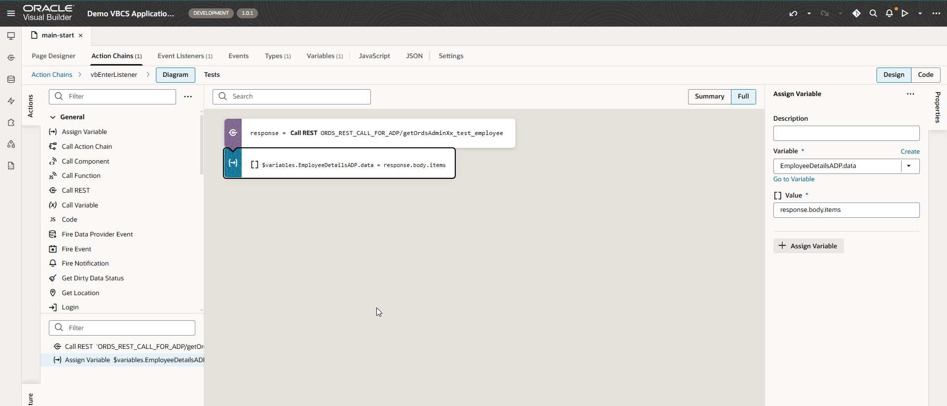 ADP variable is populated with REST API response and displayed in table.