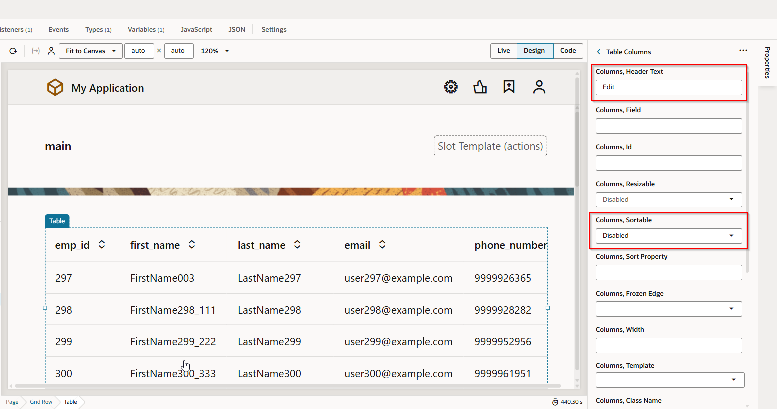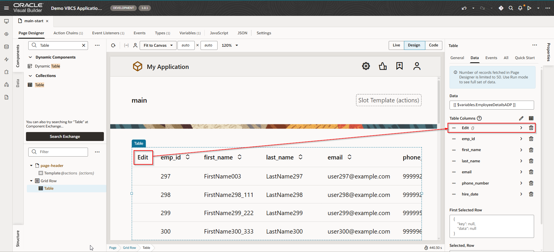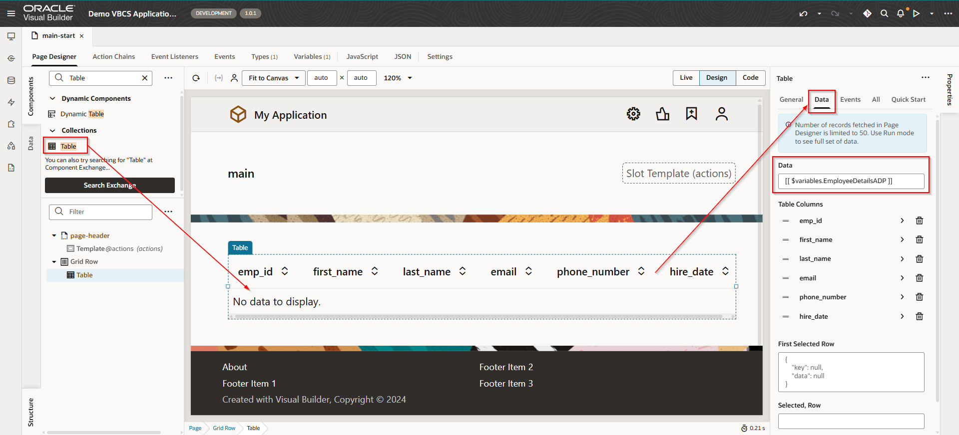 Create Table on VBCS page and assign ADP variable as data source to table.