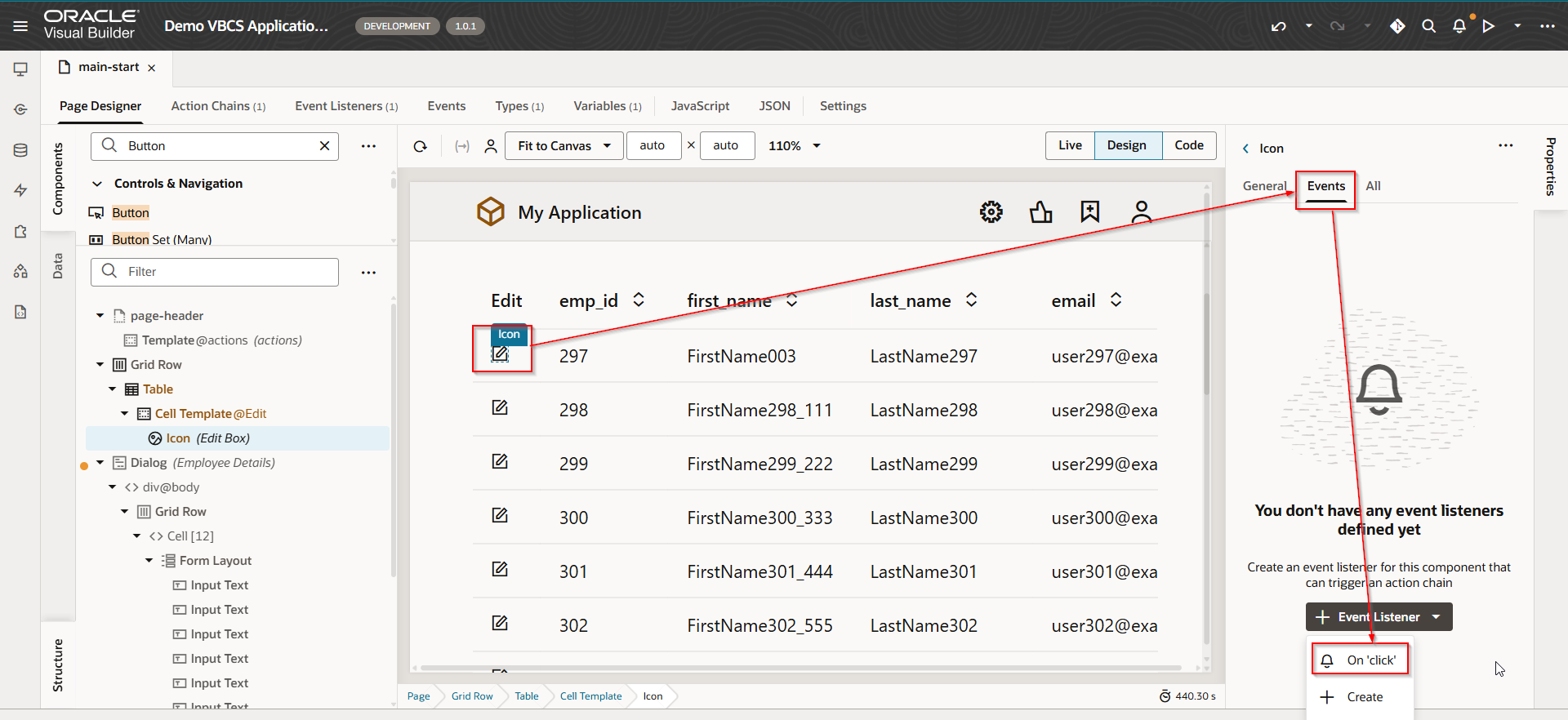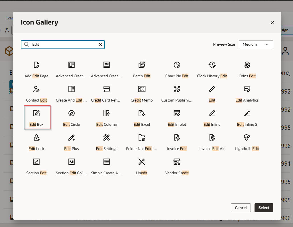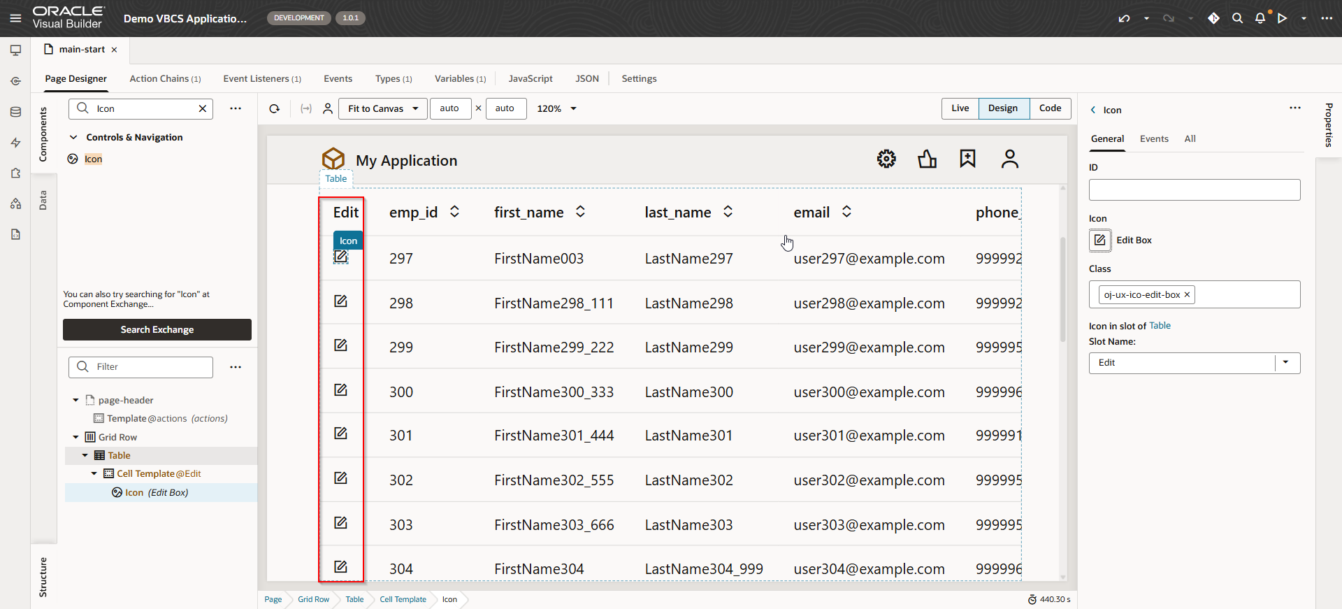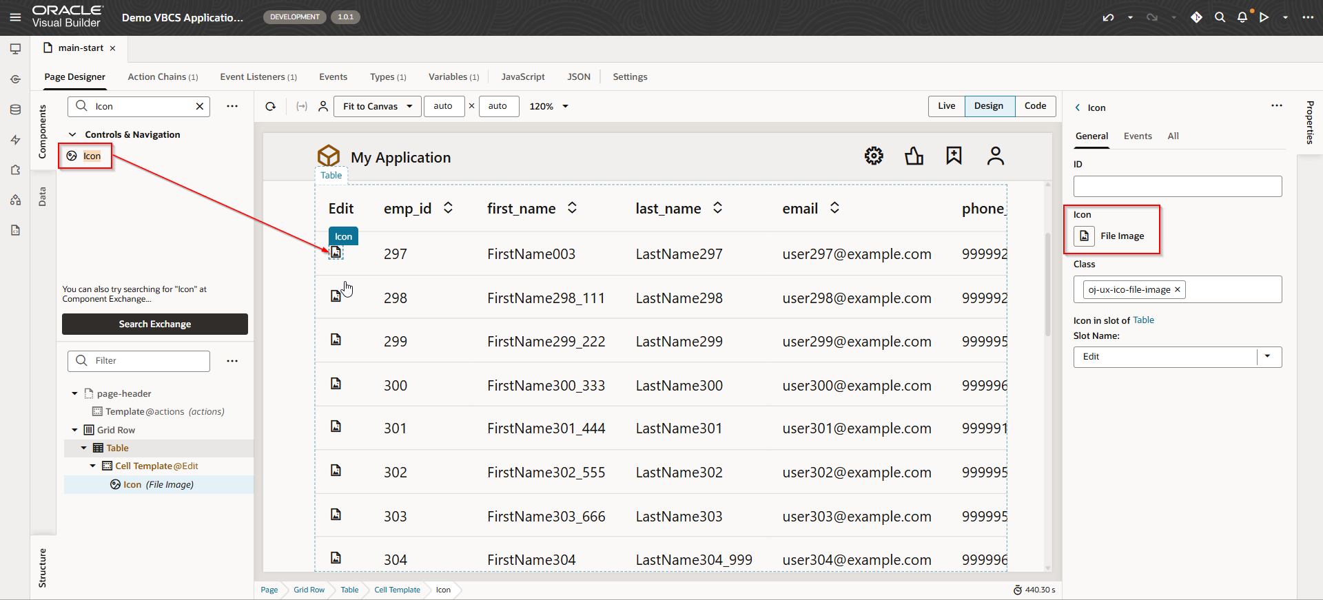 Drag and drop Icon component on Edit column.