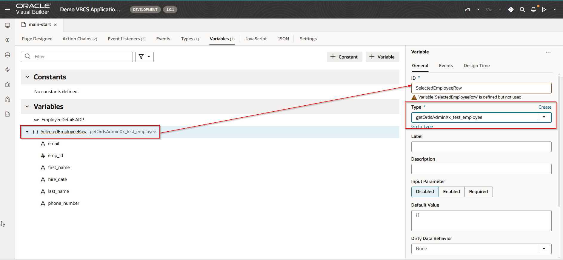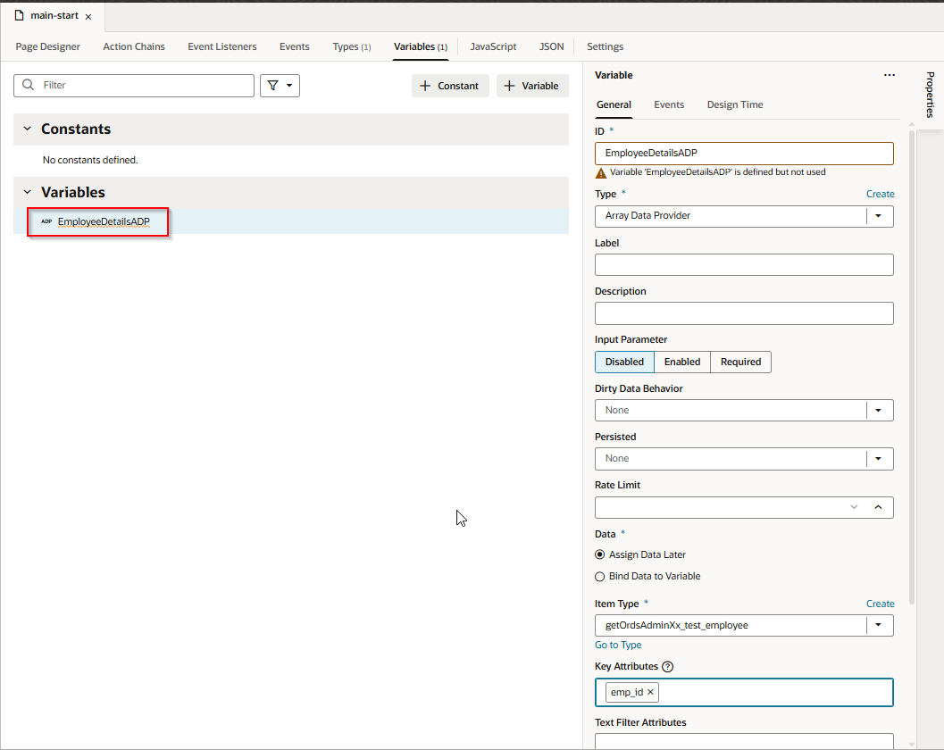 Provide Name to variable. Select Type as Array Data Provider and Item Type as type created in earlier step and provide key Attributes as emp_id.