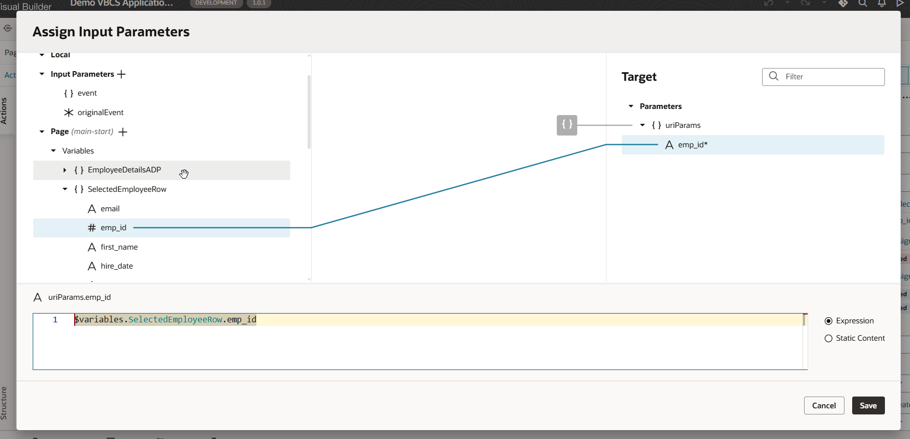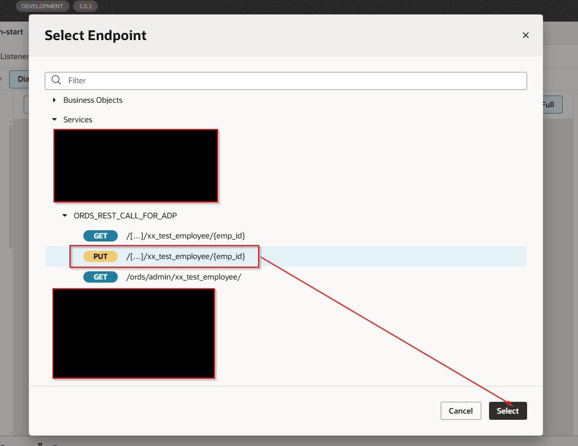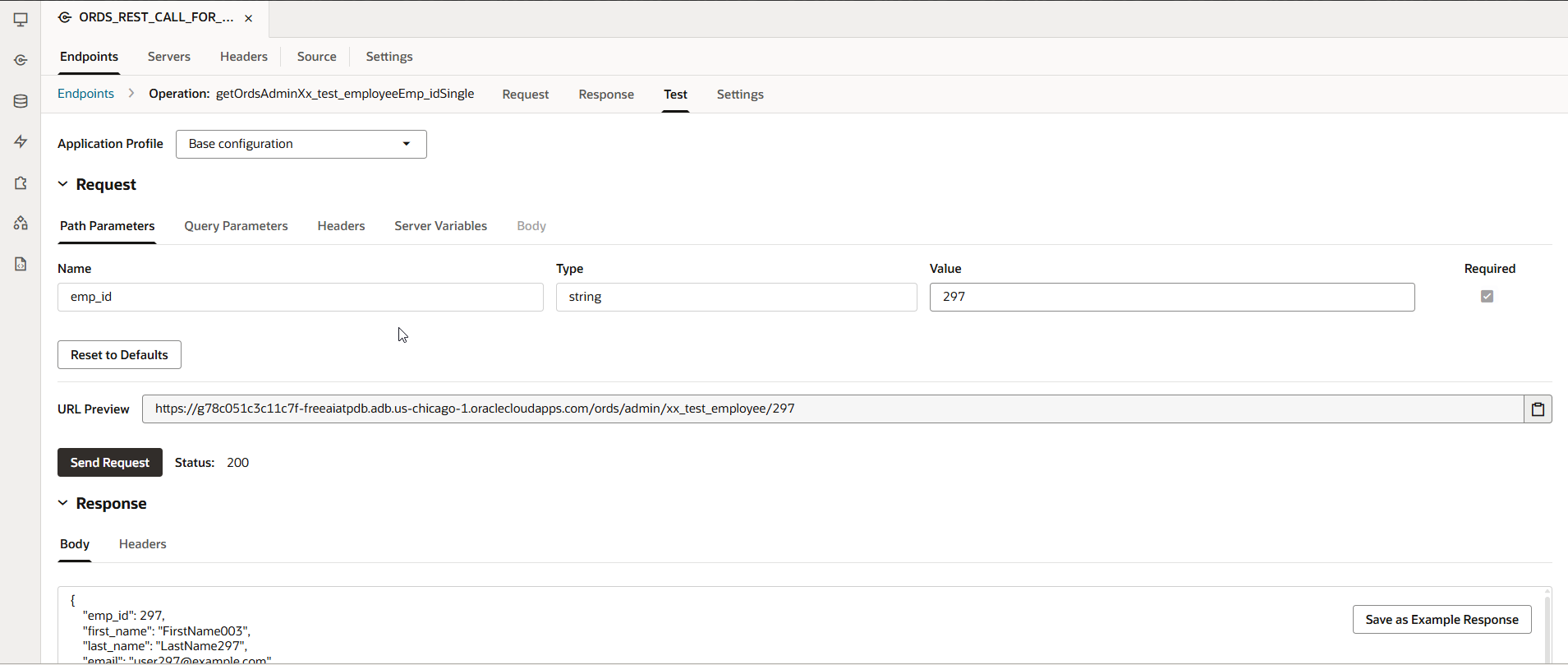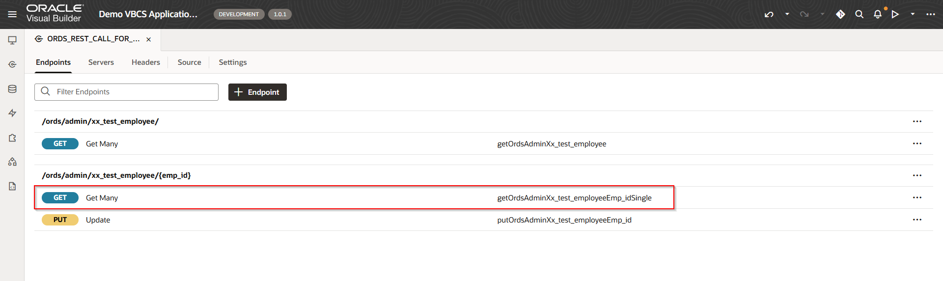 To populate SelectedEmployeeRow variable, add new endpoint for service connection as shown below with emp_id as path parameter: