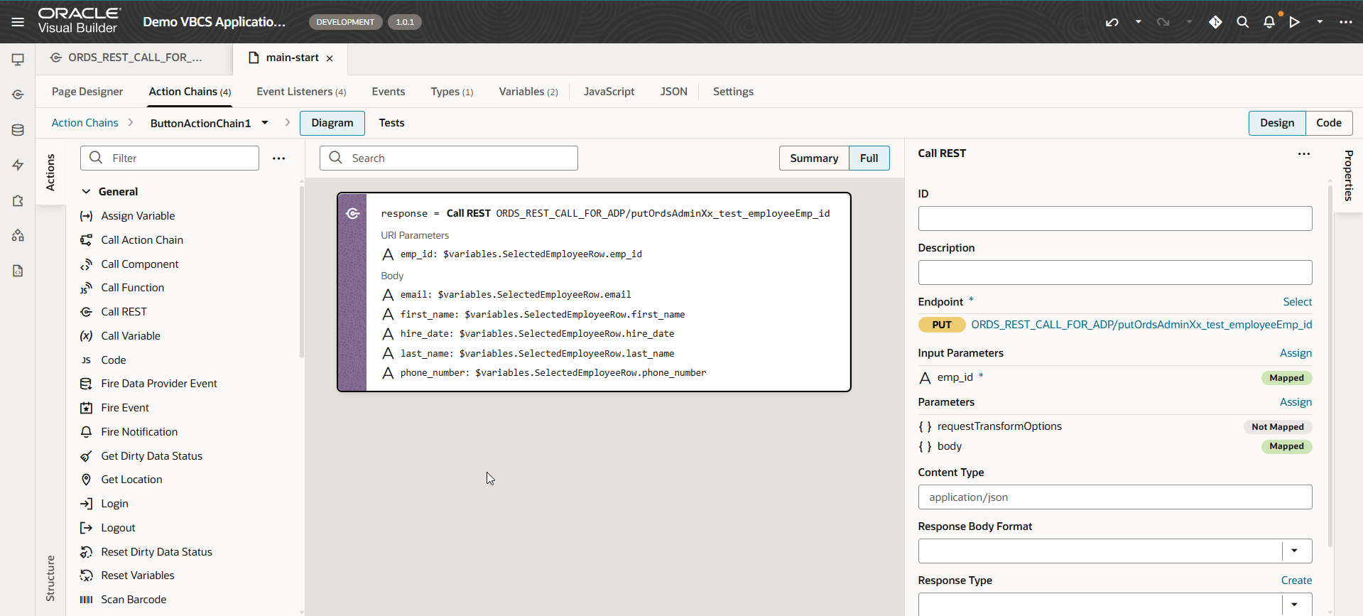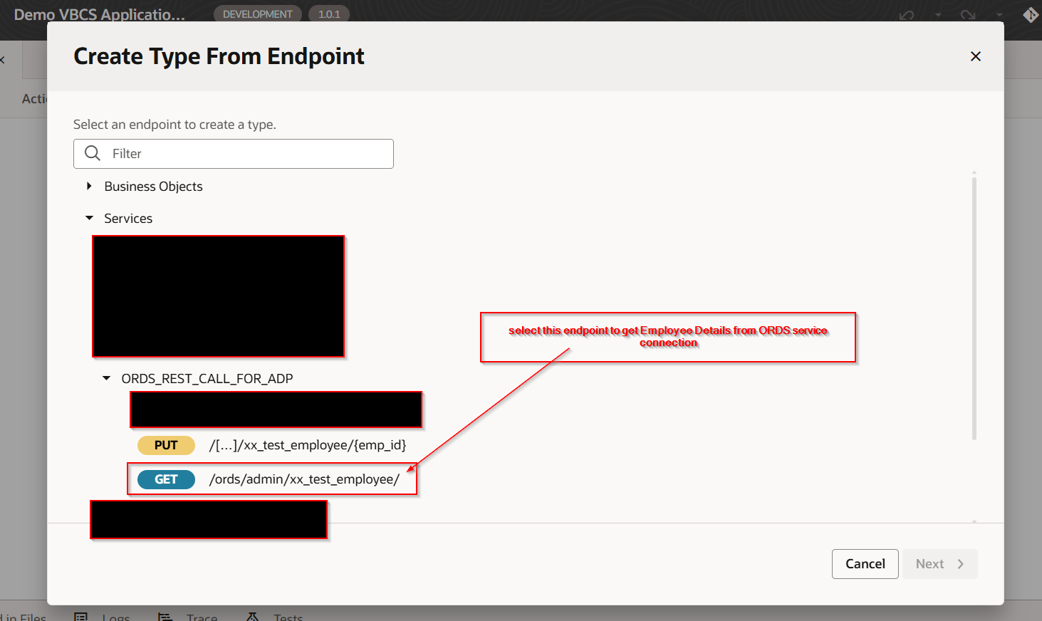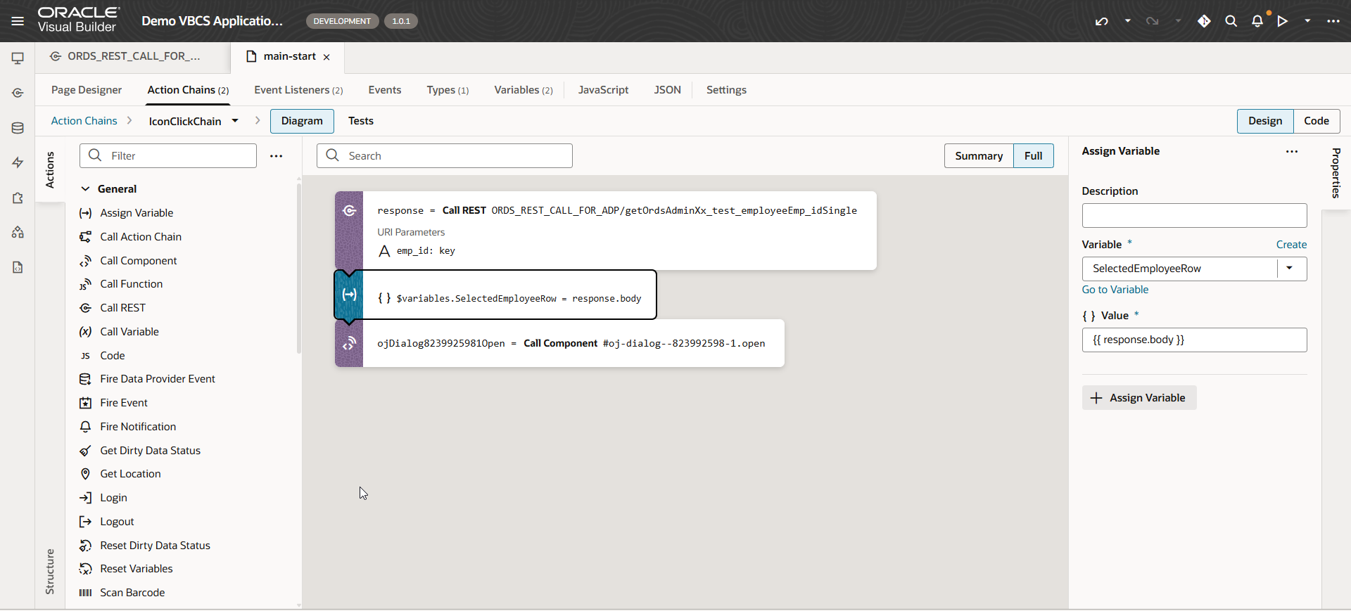 To populate SelectedEmployeeRow variable, add new endpoint for service connection as shown below with emp_id as path parameter: