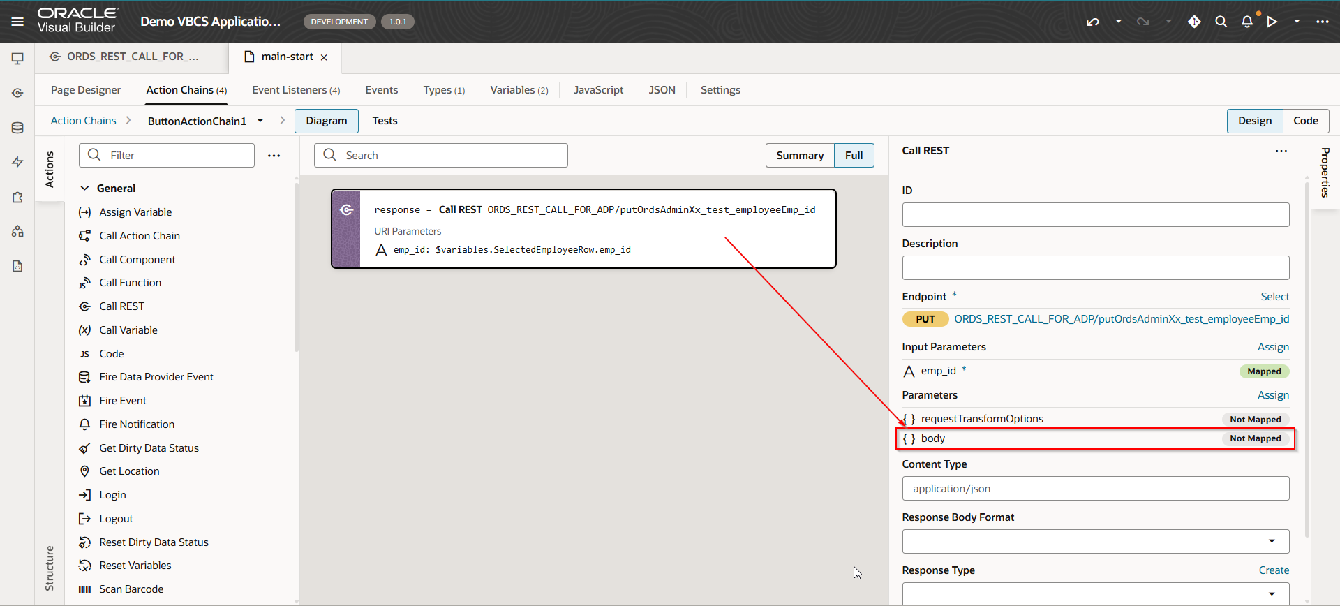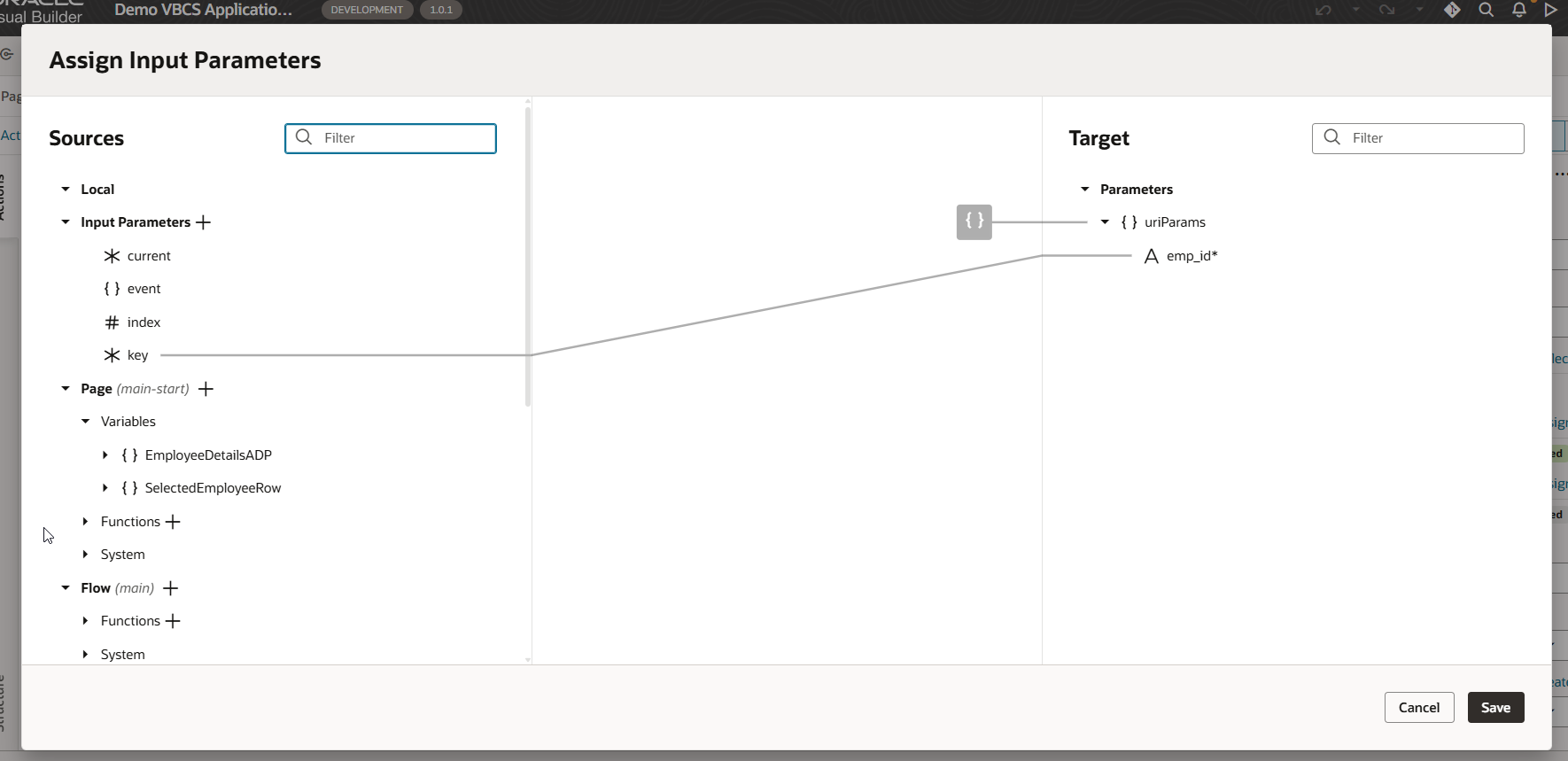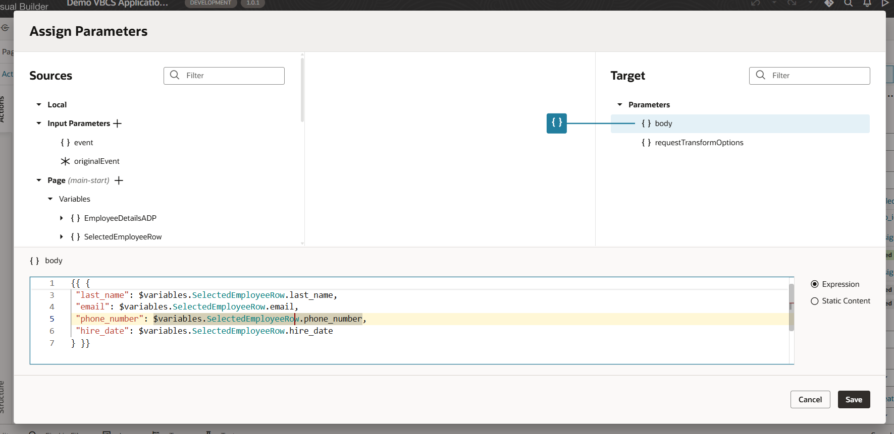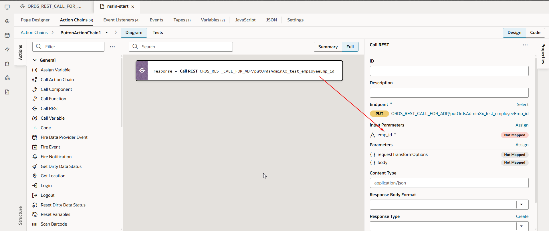 To populate SelectedEmployeeRow variable, add new endpoint for service connection as shown below with emp_id as path parameter: