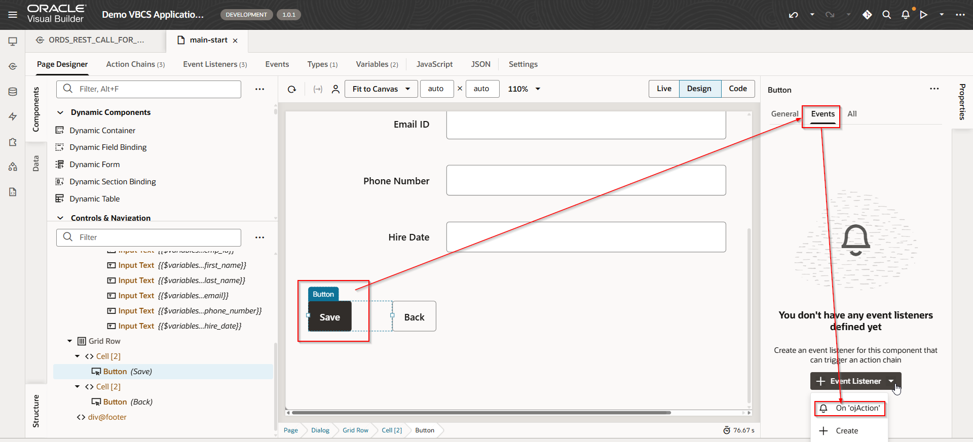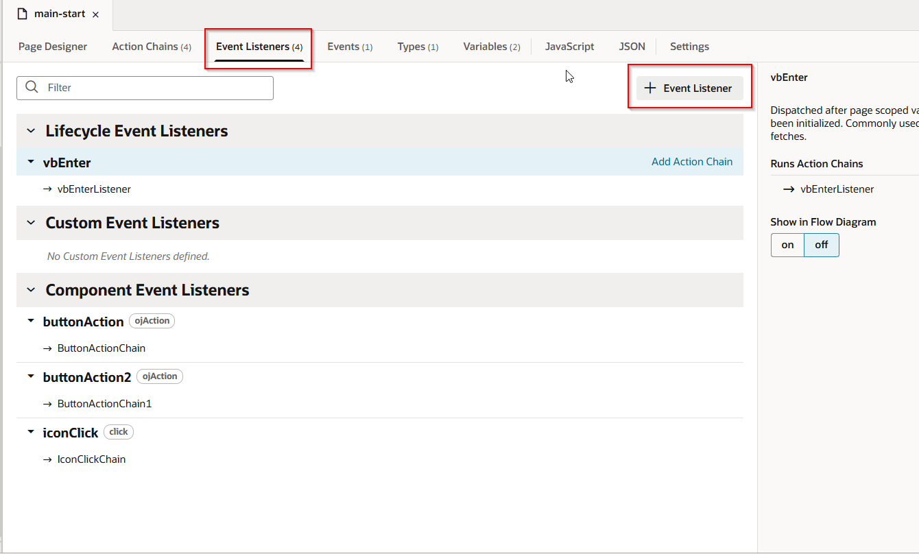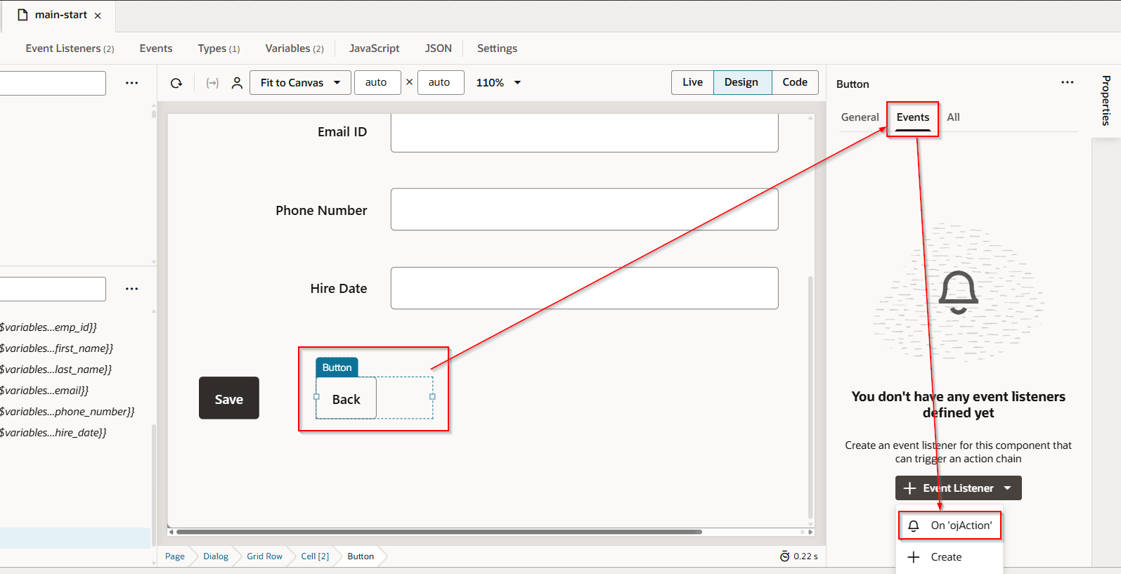 Navigate to Back Button —>Events —>Event Listener —> On ‘ojAction’