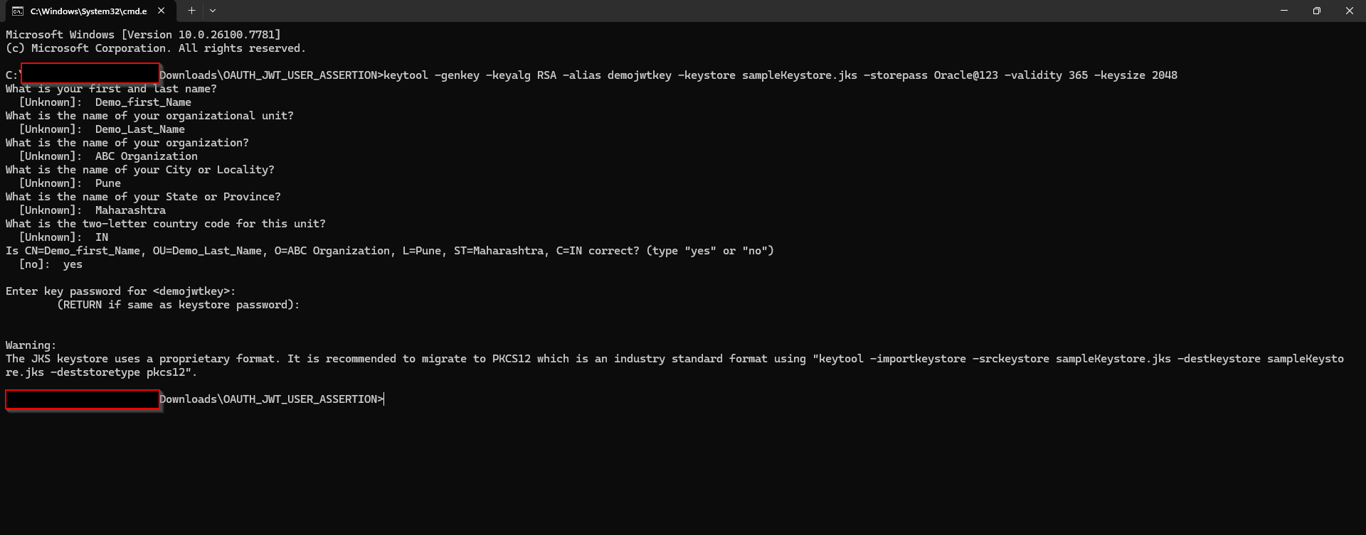 keytool -genkey -keyalg RSA -alias demojwtkey -keystore sampleKeystore.jks -storepass Oracle@123 -validity 365 -keysize 2048