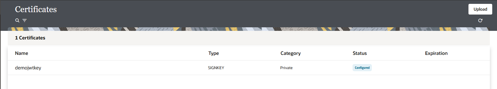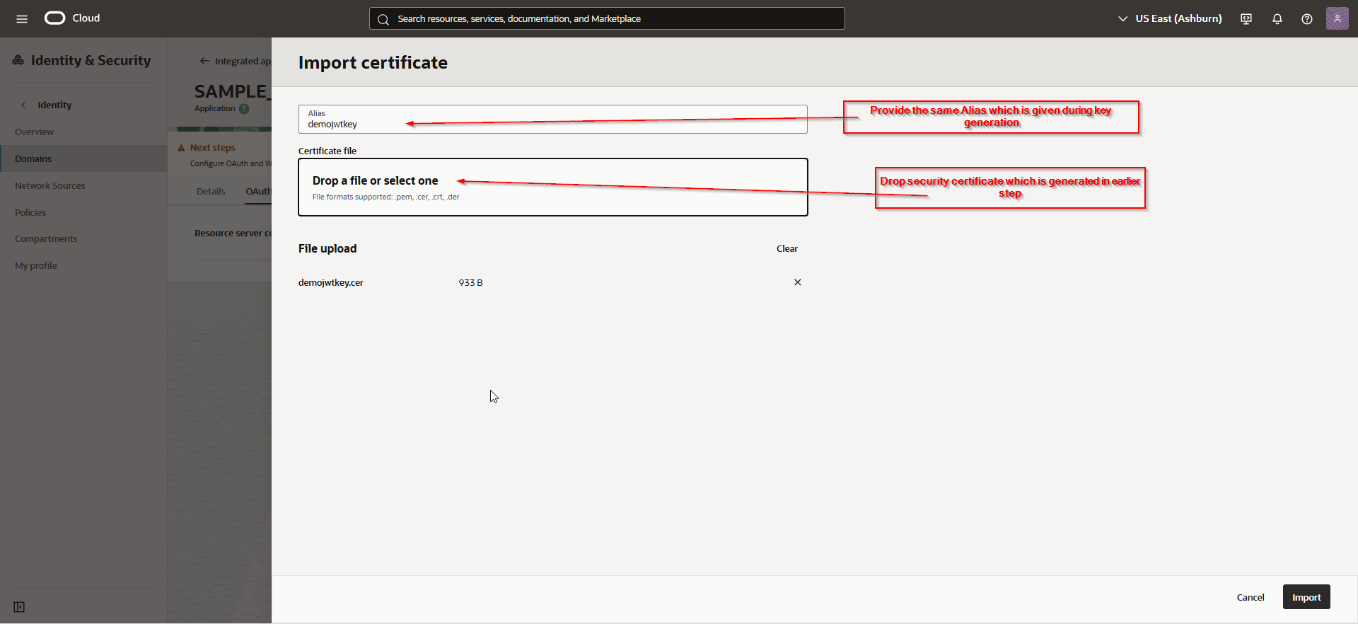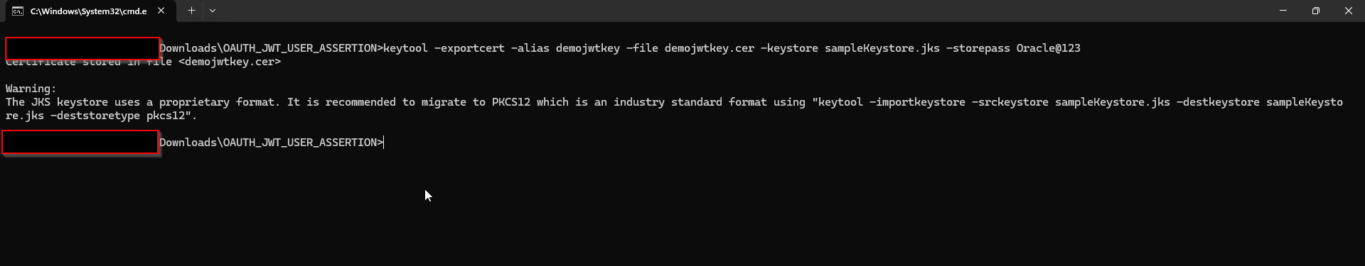 keytool -exportcert -alias <your_alias> -file <filename> -keystore <keystore_file> -storepass <password> ##example keytool -exportcert -alias demojwtkey -file demojwtkey.cer -keystore sampleKeystore.jks -storepass Oracle@123 ## This should show a success message e.g. Certificate stored in file <assert.cer>