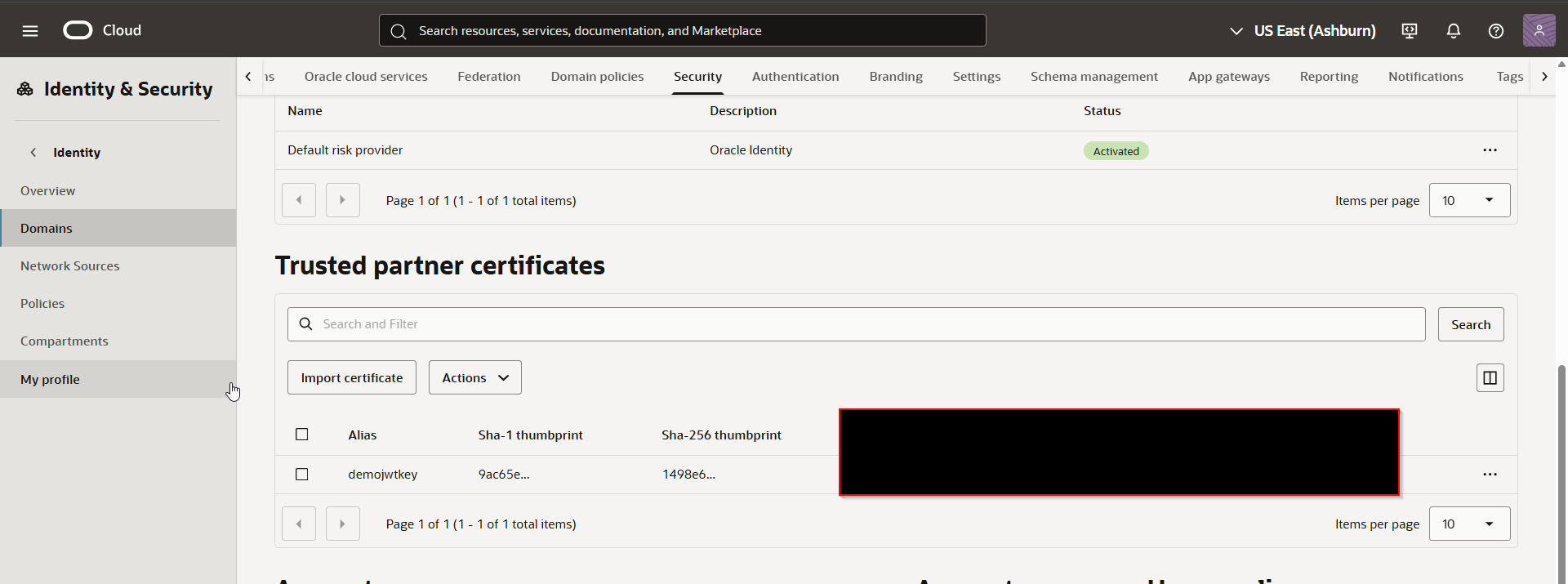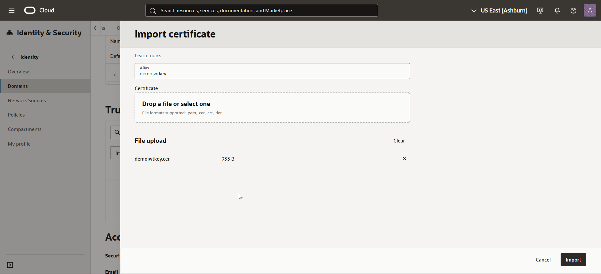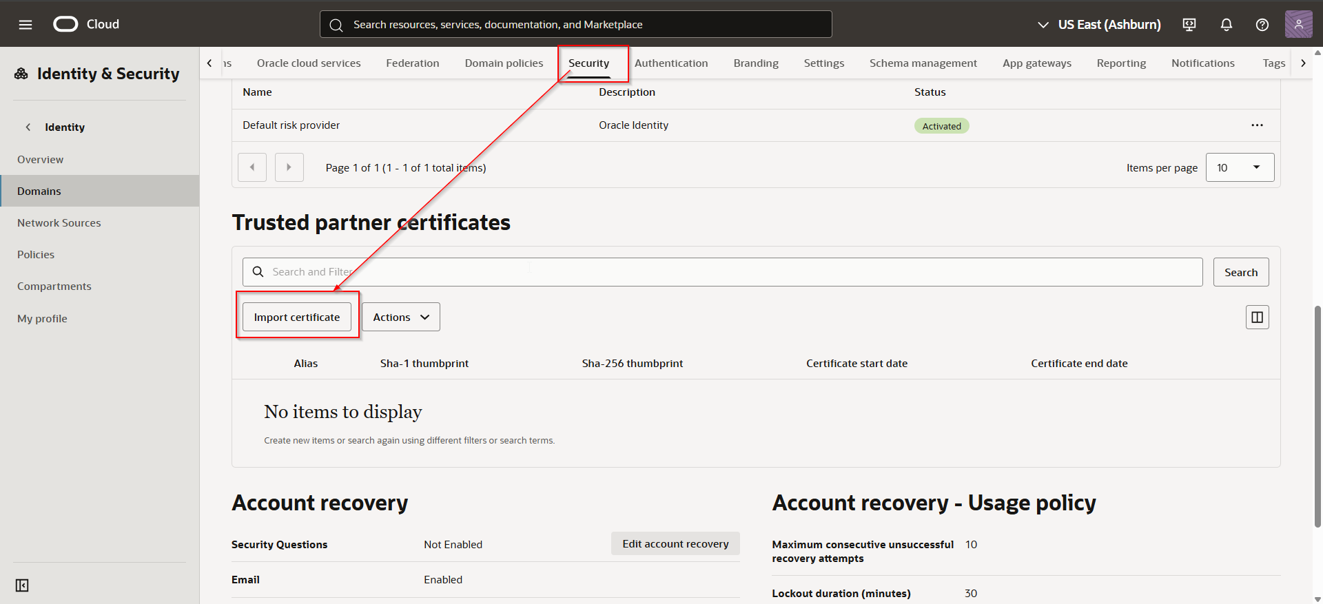 Navigate to domain —>Security —>Trusted partner certificates —>Import certificate.