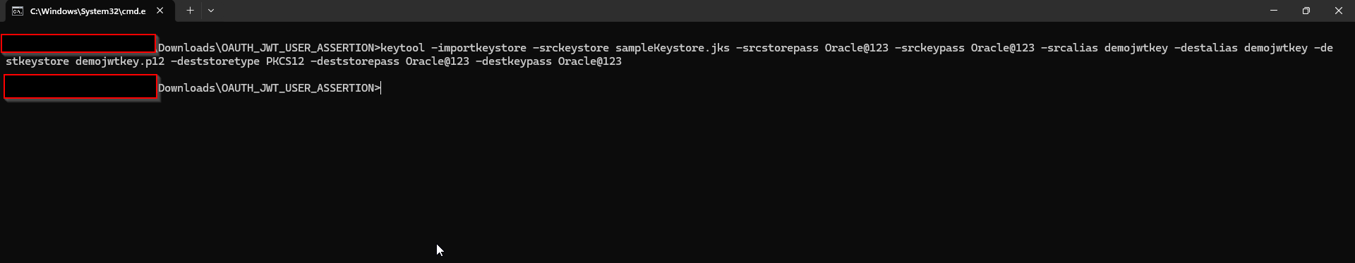 keytool -importkeystore -srckeystore <filename> -srcstorepass <password> -srckeypass <password> -srcalias <your_alias> -destalias <your_alias> -destkeystore <destFileName> -deststoretype PKCS12 -deststorepass <password> -destkeypass <password> ##example keytool -importkeystore -srckeystore sampleKeystore.jks -srcstorepass Oracle@123 -srckeypass Oracle@123 -srcalias demojwtkey -destalias demojwtkey -destkeystore demojwtkey.p12 -deststoretype PKCS12 -deststorepass Oracle@123 -destkeypass Oracle@123 ## This should show a success message e.g. Importing keystore sampleKeystore.jks to assert.p12...