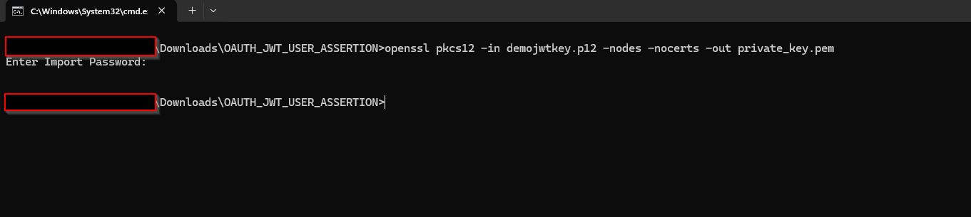 openssl pkcs12 -in <destFileName> -nodes -nocerts -out <pem_file> ##example openssl pkcs12 -in demojwtkey.p12 -nodes -nocerts -out private_key.pem ## This should show a success message: MAC verified OK